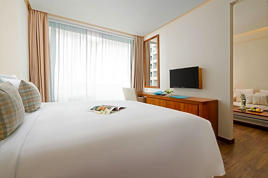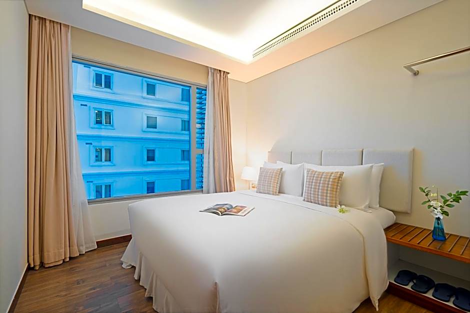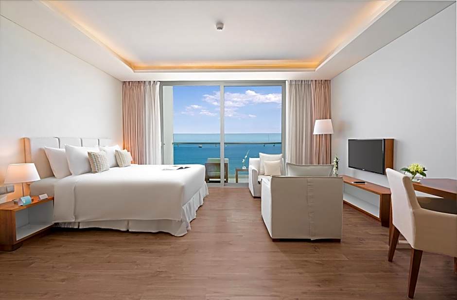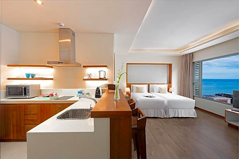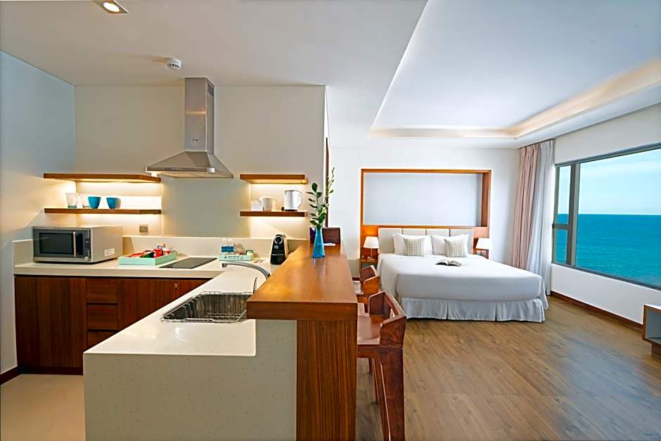 This modern and spacious apartment come with an open-plan living area. It features a balcony with direct sea views, a kitchen and bedroom with a king sized bed and private bathroom.