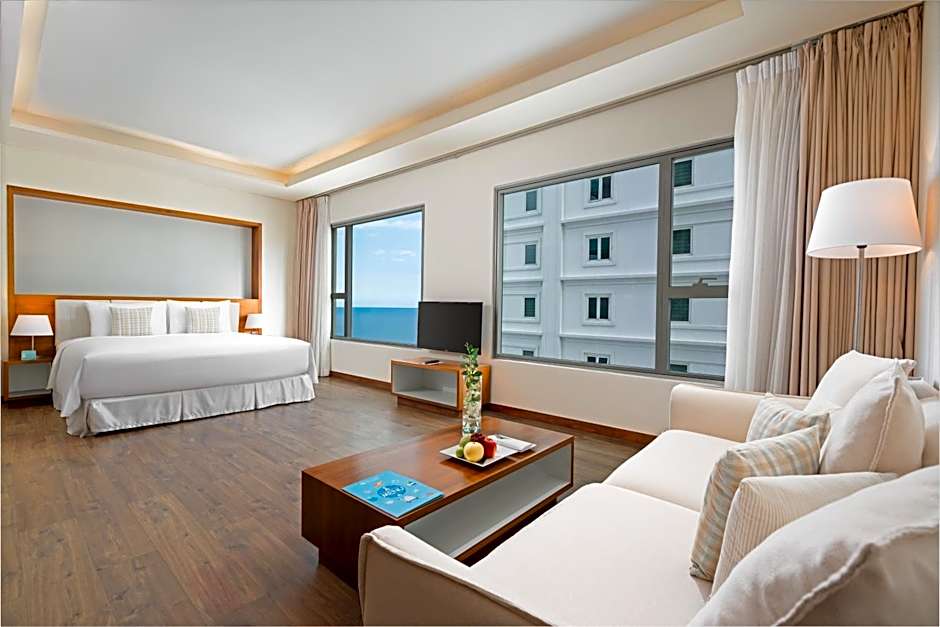 This suite features a private balcony that opens up to views of the sea. It has a seating area fitted with a sofa and a flat-screen satellite TV. The private bathroom includes a bathtub and a shower.